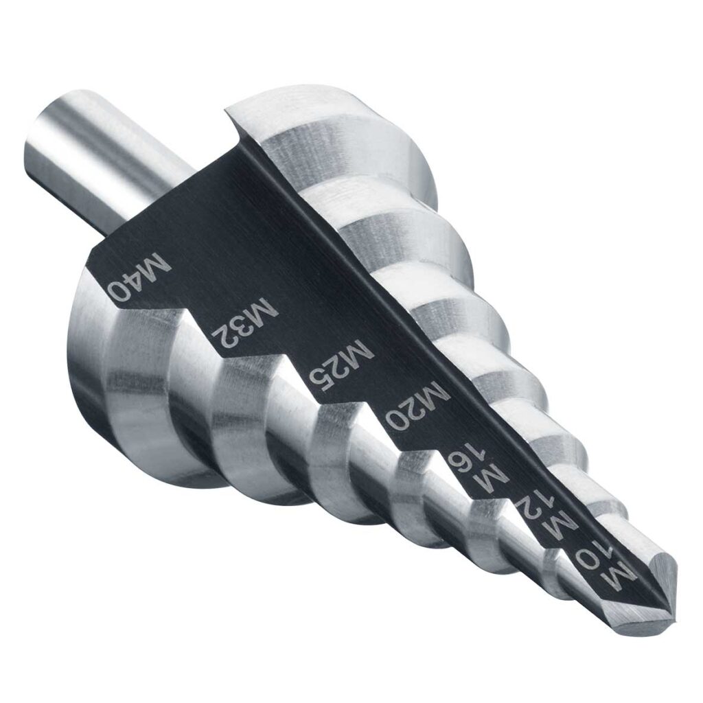 Stufenbohrera (1284-32). Uniwersalny obcinacz do otworów do precyzyjnego otwierania przepustów kablowych i rurowych w tworzywach sztucznych. Dzięki dokładnie dopasowanemu otworowi puszek i obudów, zawsze wykonywane są precyzyjnie hermetyczne, dymoszczelne i betonoszczelne wejścia.